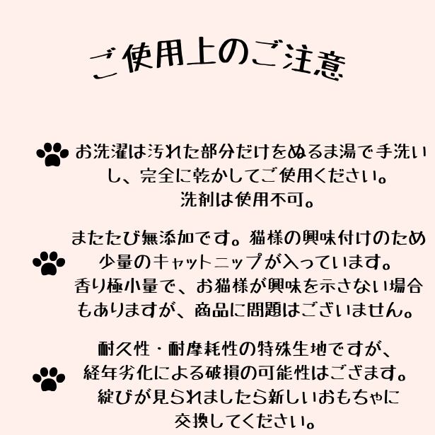 特殊生地を使用したこのおもちゃは、耐摩耗性と耐久性に優れ、愛猫が思い切り遊んでも壊れにくい設計です。